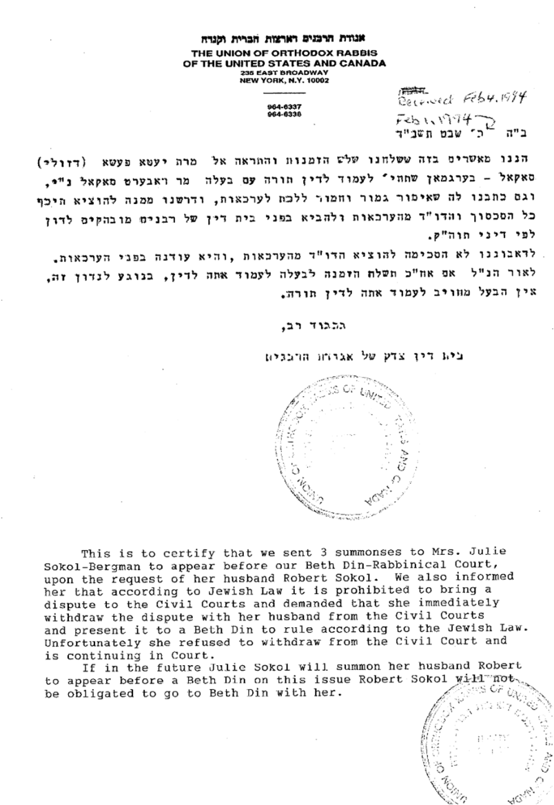 Beth Din Ruling from the Union of Orthodox